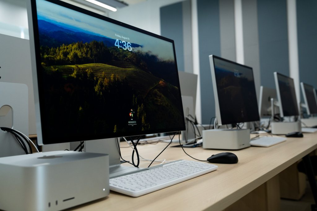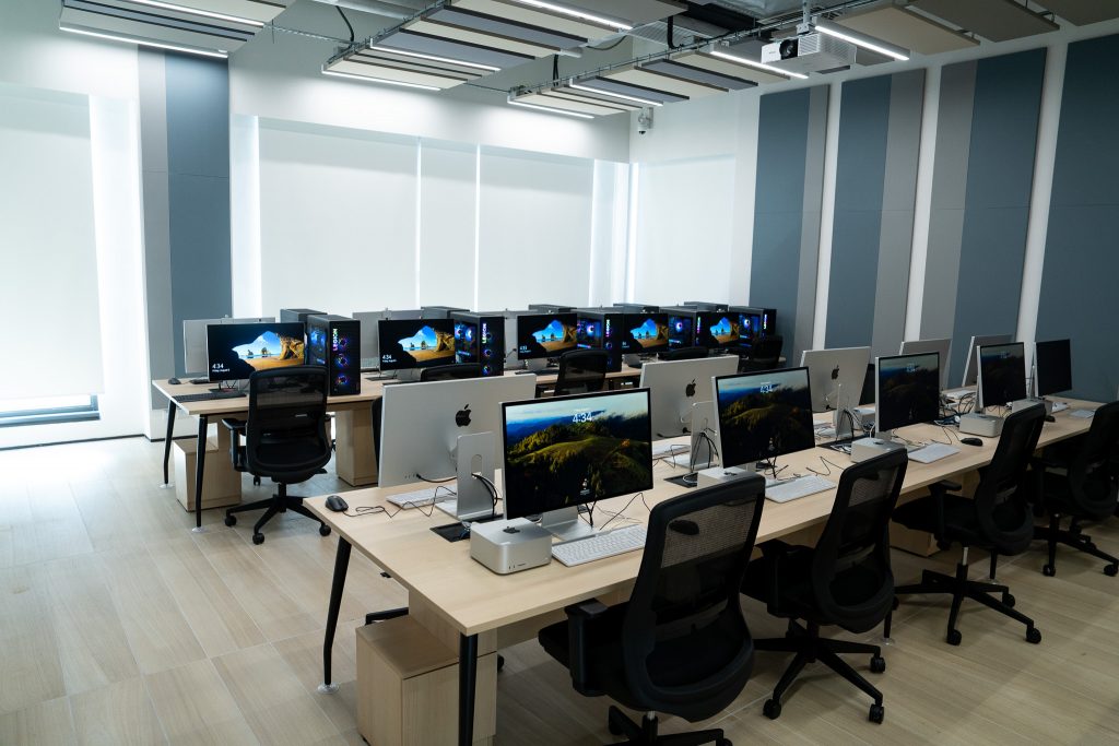The Multimedia Commons is a specialized facility engineered to support computationally intensive tasks, from complex 3D environment design to professional-grade multimedia post-production. To mirror the diverse technology landscape of the creative industries, we offer a unique dual-platform environment. This includes 10 Apple Mac Studios and 10 high-end Windows-based PCs, ensuring students gain experience with a variety of industry-standard hardware. Every workstation is fully licensed with a suite of creative tools, including Apple’s Final Cut Pro and the complete Adobe Creative Cloud collection. Furthermore, each computer is paired with a high-resolution, color-accurate display, which is crucial for professional development in the multimedia sector. We invite you to come and experience a professional-level creative environment.